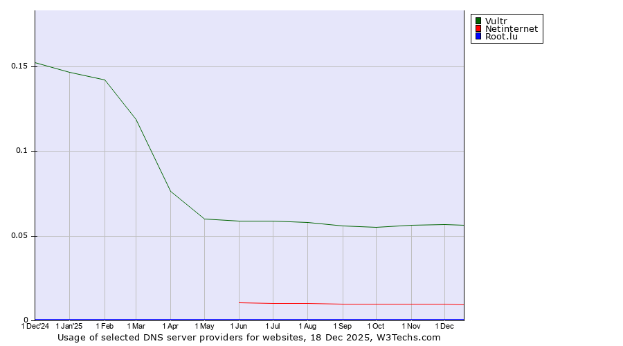 TechnologiesContent ManagementServer-side Languages Client-side Languages JavaScript Libraries CSS Frameworks Web Servers Web Panels Operating Systems Web Hosting Data Centers Reverse Proxies DNS Servers Email Servers SSL Certificate Authorities Content Delivery Traffic Analysis Tools Advertising Networks Tag Managers Social Widgets Site Elements Structured Data Markup Languages Character Encodings Image File Formats Top Level Domains Server Locations Content Languages | Technologies > DNS Servers > Technology usage comparison Comparison of the usage statistics of Vultr vs. Netinternet vs. Root.lu for websitesThis report shows the usage statistics of Vultr vs. Netinternet vs. Root.lu as DNS server provider on the web. See technologies overview for explanations on the methodologies used in the surveys. Our reports are updated daily. UsageThis diagram shows the percentages of websites using the selected technologies. How to read the diagram: