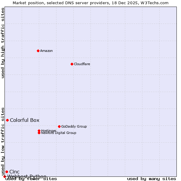 TechnologiesContent ManagementServer-side Languages Client-side Languages JavaScript Libraries CSS Frameworks Web Servers Web Panels Operating Systems Web Hosting Data Centers Reverse Proxies DNS Servers Email Servers SSL Certificate Authorities Content Delivery Traffic Analysis Tools Advertising Networks Tag Managers Social Widgets Site Elements Structured Data Markup Languages Character Encodings Image File Formats Top Level Domains Server Locations Content Languages | Technologies > DNS Servers > Technology usage comparison Comparison of the usage statistics of Colorful Box vs. Cinc vs. Webhost Python for websitesThis report shows the usage statistics of Colorful Box vs. Cinc vs. Webhost Python as DNS server provider on the web. See technologies overview for explanations on the methodologies used in the surveys. Our reports are updated daily. UsageThis diagram shows the percentages of websites using the selected technologies. How to read the diagram: