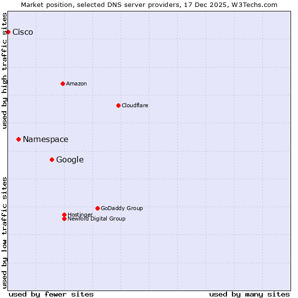 TechnologiesContent ManagementServer-side Languages Client-side Languages JavaScript Libraries CSS Frameworks Web Servers Web Panels Operating Systems Web Hosting Data Centers Reverse Proxies DNS Servers Email Servers SSL Certificate Authorities Content Delivery Traffic Analysis Tools Advertising Networks Tag Managers Social Widgets Site Elements Structured Data Markup Languages Character Encodings Image File Formats Top Level Domains Server Locations Content Languages | Technologies > DNS Servers > Technology usage comparison Comparison of the usage statistics of Google vs. Namespace vs. Cisco for websitesThis report shows the usage statistics of Google vs. Namespace vs. Cisco as DNS server provider on the web. See technologies overview for explanations on the methodologies used in the surveys. Our reports are updated daily. UsageThis diagram shows the percentages of websites using the selected technologies. How to read the diagram: