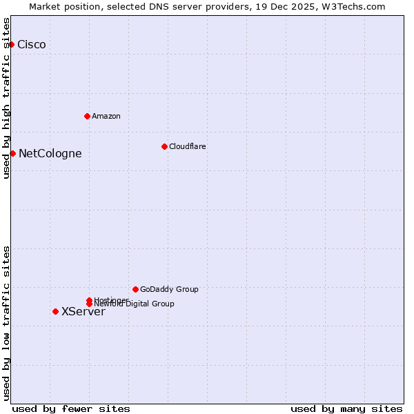 TechnologiesContent ManagementServer-side Languages Client-side Languages JavaScript Libraries CSS Frameworks Web Servers Web Panels Operating Systems Web Hosting Data Centers Reverse Proxies DNS Servers Email Servers SSL Certificate Authorities Content Delivery Traffic Analysis Tools Advertising Networks Tag Managers Social Widgets Site Elements Structured Data Markup Languages Character Encodings Image File Formats Top Level Domains Server Locations Content Languages | Technologies > DNS Servers > Technology usage comparison Comparison of the usage statistics of XServer vs. NetCologne vs. Cisco for websitesThis report shows the usage statistics of XServer vs. NetCologne vs. Cisco as DNS server provider on the web. See technologies overview for explanations on the methodologies used in the surveys. Our reports are updated daily. UsageThis diagram shows the percentages of websites using the selected technologies. How to read the diagram: