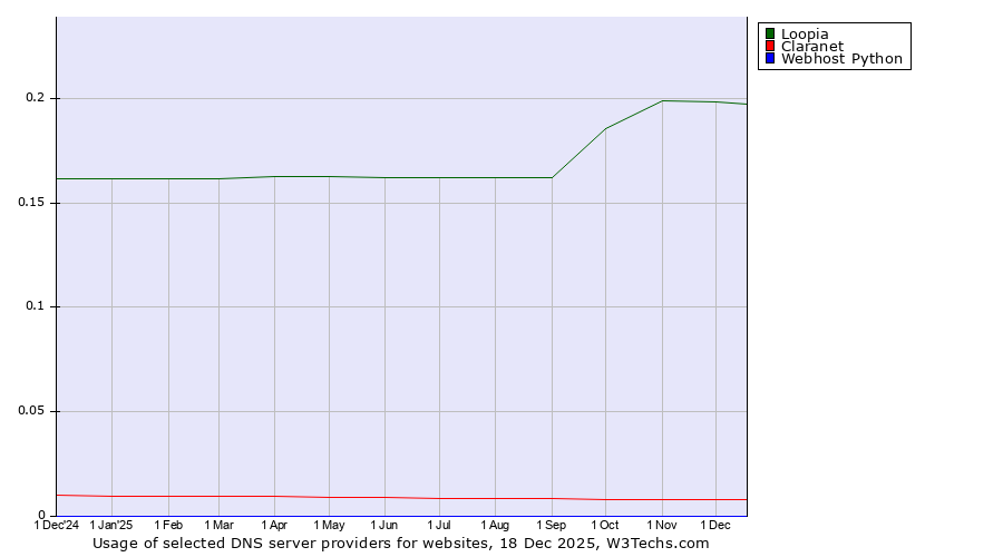 TechnologiesContent ManagementServer-side Languages Client-side Languages JavaScript Libraries CSS Frameworks Web Servers Web Panels Operating Systems Web Hosting Data Centers Reverse Proxies DNS Servers Email Servers SSL Certificate Authorities Content Delivery Traffic Analysis Tools Advertising Networks Tag Managers Social Widgets Site Elements Structured Data Markup Languages Character Encodings Image File Formats Top Level Domains Server Locations Content Languages | Technologies > DNS Servers > Technology usage comparison Comparison of the usage statistics of Loopia vs. Claranet vs. Webhost Python for websitesThis report shows the usage statistics of Loopia vs. Claranet vs. Webhost Python as DNS server provider on the web. See technologies overview for explanations on the methodologies used in the surveys. Our reports are updated daily. UsageThis diagram shows the percentages of websites using the selected technologies. How to read the diagram: