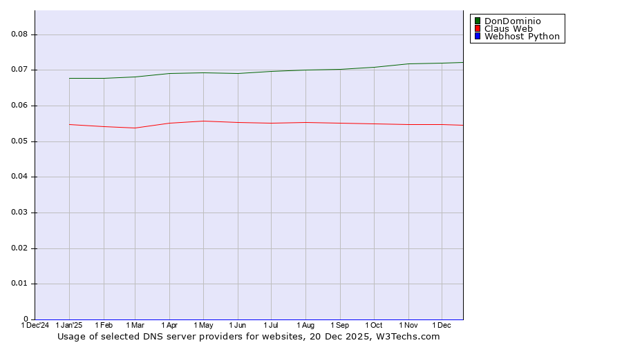 TechnologiesContent ManagementServer-side Languages Client-side Languages JavaScript Libraries CSS Frameworks Web Servers Web Panels Operating Systems Web Hosting Data Centers Reverse Proxies DNS Servers Email Servers SSL Certificate Authorities Content Delivery Traffic Analysis Tools Advertising Networks Tag Managers Social Widgets Site Elements Structured Data Markup Languages Character Encodings Image File Formats Top Level Domains Server Locations Content Languages | Technologies > DNS Servers > Technology usage comparison Comparison of the usage statistics of DonDominio vs. Claus Web vs. Webhost Python for websitesThis report shows the usage statistics of DonDominio vs. Claus Web vs. Webhost Python as DNS server provider on the web. See technologies overview for explanations on the methodologies used in the surveys. Our reports are updated daily. UsageThis diagram shows the percentages of websites using the selected technologies. How to read the diagram: