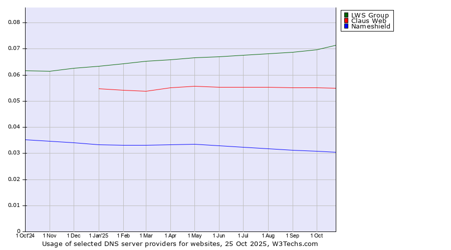 TechnologiesContent ManagementServer-side Languages Client-side Languages JavaScript Libraries CSS Frameworks Web Servers Web Panels Operating Systems Web Hosting Data Centers Reverse Proxies DNS Servers Email Servers SSL Certificate Authorities Content Delivery Traffic Analysis Tools Advertising Networks Tag Managers Social Widgets Site Elements Structured Data Markup Languages Character Encodings Image File Formats Top Level Domains Server Locations Content Languages | Technologies > DNS Servers > Technology usage comparison Comparison of the usage statistics of LWS Group vs. Claus Web vs. Nameshield for websitesThis report shows the usage statistics of LWS Group vs. Claus Web vs. Nameshield as DNS server provider on the web. See technologies overview for explanations on the methodologies used in the surveys. Our reports are updated daily. UsageThis diagram shows the percentages of websites using the selected technologies. How to read the diagram: