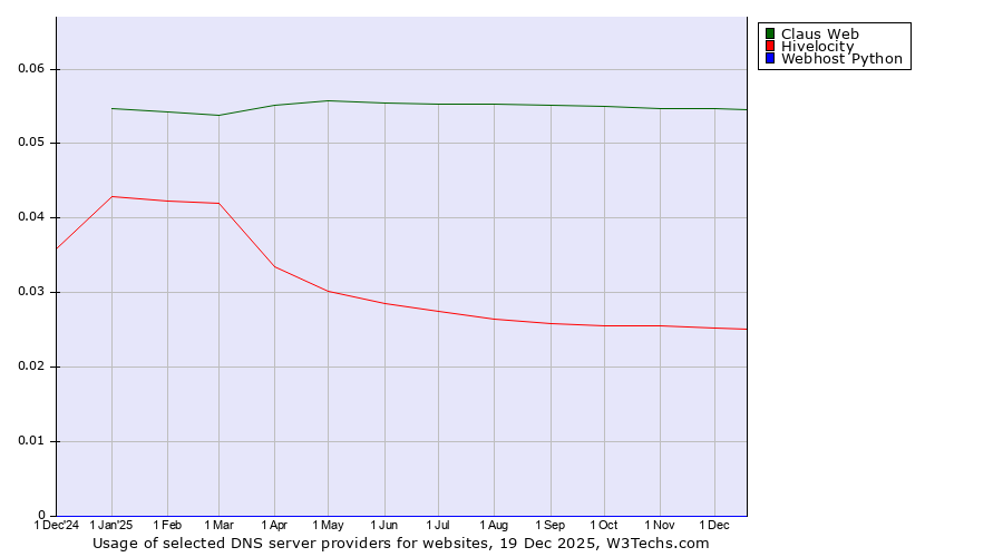 TechnologiesContent ManagementServer-side Languages Client-side Languages JavaScript Libraries CSS Frameworks Web Servers Web Panels Operating Systems Web Hosting Data Centers Reverse Proxies DNS Servers Email Servers SSL Certificate Authorities Content Delivery Traffic Analysis Tools Advertising Networks Tag Managers Social Widgets Site Elements Structured Data Markup Languages Character Encodings Image File Formats Top Level Domains Server Locations Content Languages | Technologies > DNS Servers > Technology usage comparison Comparison of the usage statistics of Claus Web vs. Hivelocity vs. Webhost Python for websitesThis report shows the usage statistics of Claus Web vs. Hivelocity vs. Webhost Python as DNS server provider on the web. See technologies overview for explanations on the methodologies used in the surveys. Our reports are updated daily. UsageThis diagram shows the percentages of websites using the selected technologies. How to read the diagram: