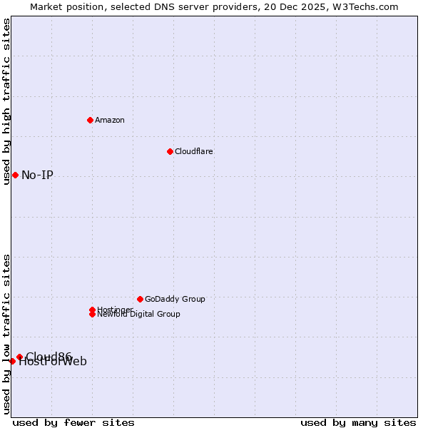 TechnologiesContent ManagementServer-side Languages Client-side Languages JavaScript Libraries CSS Frameworks Web Servers Web Panels Operating Systems Web Hosting Data Centers Reverse Proxies DNS Servers Email Servers SSL Certificate Authorities Content Delivery Traffic Analysis Tools Advertising Networks Tag Managers Social Widgets Site Elements Structured Data Markup Languages Character Encodings Image File Formats Top Level Domains Server Locations Content Languages | Technologies > DNS Servers > Technology usage comparison Comparison of the usage statistics of Cloud86 vs. No-IP vs. HostForWeb for websitesThis report shows the usage statistics of Cloud86 vs. No-IP vs. HostForWeb as DNS server provider on the web. See technologies overview for explanations on the methodologies used in the surveys. Our reports are updated daily. UsageThis diagram shows the percentages of websites using the selected technologies. How to read the diagram:
