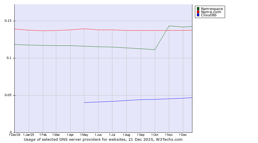 TechnologiesContent ManagementServer-side Languages Client-side Languages JavaScript Libraries CSS Frameworks Web Servers Web Panels Operating Systems Web Hosting Data Centers Reverse Proxies DNS Servers Email Servers SSL Certificate Authorities Content Delivery Traffic Analysis Tools Advertising Networks Tag Managers Social Widgets Site Elements Structured Data Markup Languages Character Encodings Image File Formats Top Level Domains Server Locations Content Languages | Technologies > DNS Servers > Technology usage comparison Comparison of the usage statistics of Namespace vs. Name.com vs. Cloud86 for websitesThis report shows the usage statistics of Namespace vs. Name.com vs. Cloud86 as DNS server provider on the web. See technologies overview for explanations on the methodologies used in the surveys. Our reports are updated daily. UsageThis diagram shows the percentages of websites using the selected technologies. How to read the diagram: