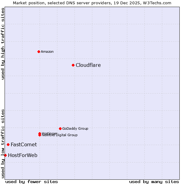 TechnologiesContent ManagementServer-side Languages Client-side Languages JavaScript Libraries CSS Frameworks Web Servers Web Panels Operating Systems Web Hosting Data Centers Reverse Proxies DNS Servers Email Servers SSL Certificate Authorities Content Delivery Traffic Analysis Tools Advertising Networks Tag Managers Social Widgets Site Elements Structured Data Markup Languages Character Encodings Image File Formats Top Level Domains Server Locations Content Languages | Technologies > DNS Servers > Technology usage comparison Comparison of the usage statistics of Cloudflare vs. FastComet vs. HostForWeb for websitesThis report shows the usage statistics of Cloudflare vs. FastComet vs. HostForWeb as DNS server provider on the web. See technologies overview for explanations on the methodologies used in the surveys. Our reports are updated daily. UsageThis diagram shows the percentages of websites using the selected technologies. How to read the diagram:
