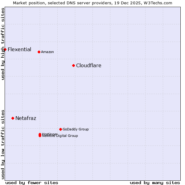 TechnologiesContent ManagementServer-side Languages Client-side Languages JavaScript Libraries CSS Frameworks Web Servers Web Panels Operating Systems Web Hosting Data Centers Reverse Proxies DNS Servers Email Servers SSL Certificate Authorities Content Delivery Traffic Analysis Tools Advertising Networks Tag Managers Social Widgets Site Elements Structured Data Markup Languages Character Encodings Image File Formats Top Level Domains Server Locations Content Languages | Technologies > DNS Servers > Technology usage comparison Comparison of the usage statistics of Cloudflare vs. Netafraz vs. Flexential for websitesThis report shows the usage statistics of Cloudflare vs. Netafraz vs. Flexential as DNS server provider on the web. See technologies overview for explanations on the methodologies used in the surveys. Our reports are updated daily. UsageThis diagram shows the percentages of websites using the selected technologies. How to read the diagram: