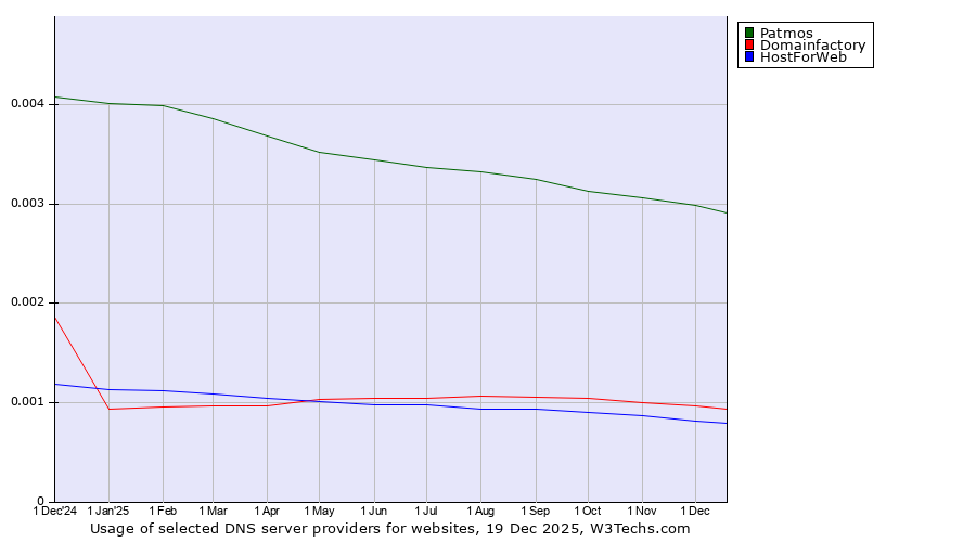 TechnologiesContent ManagementServer-side Languages Client-side Languages JavaScript Libraries CSS Frameworks Web Servers Web Panels Operating Systems Web Hosting Data Centers Reverse Proxies DNS Servers Email Servers SSL Certificate Authorities Content Delivery Traffic Analysis Tools Advertising Networks Tag Managers Social Widgets Site Elements Structured Data Markup Languages Character Encodings Image File Formats Top Level Domains Server Locations Content Languages | Technologies > DNS Servers > Technology usage comparison Comparison of the usage statistics of Patmos vs. Domainfactory vs. HostForWeb for websitesThis report shows the usage statistics of Patmos vs. Domainfactory vs. HostForWeb as DNS server provider on the web. See technologies overview for explanations on the methodologies used in the surveys. Our reports are updated daily. UsageThis diagram shows the percentages of websites using the selected technologies. How to read the diagram: