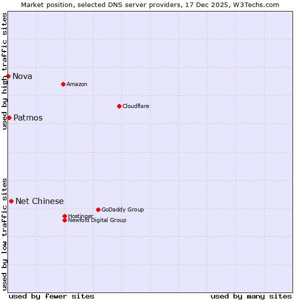 TechnologiesContent ManagementServer-side Languages Client-side Languages JavaScript Libraries CSS Frameworks Web Servers Web Panels Operating Systems Web Hosting Data Centers Reverse Proxies DNS Servers Email Servers SSL Certificate Authorities Content Delivery Traffic Analysis Tools Advertising Networks Tag Managers Social Widgets Site Elements Structured Data Markup Languages Character Encodings Image File Formats Top Level Domains Server Locations Content Languages | Technologies > DNS Servers > Technology usage comparison Comparison of the usage statistics of Net Chinese vs. Patmos vs. Nova for websitesThis report shows the usage statistics of Net Chinese vs. Patmos vs. Nova as DNS server provider on the web. See technologies overview for explanations on the methodologies used in the surveys. Our reports are updated daily. UsageThis diagram shows the percentages of websites using the selected technologies. How to read the diagram: