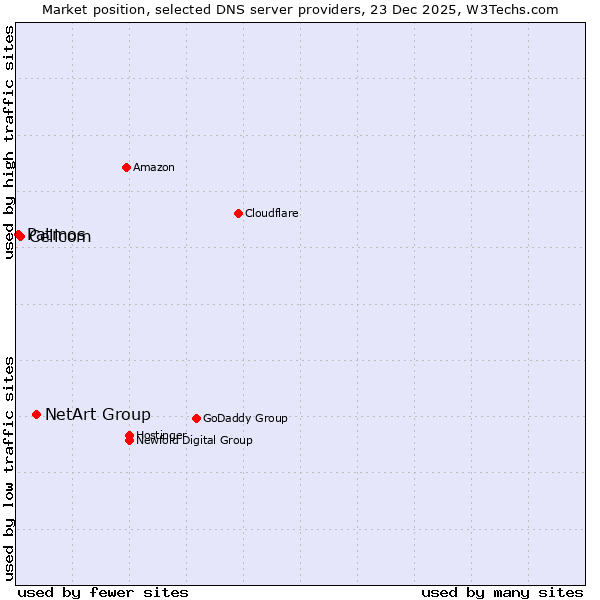 TechnologiesContent ManagementServer-side Languages Client-side Languages JavaScript Libraries CSS Frameworks Web Servers Web Panels Operating Systems Web Hosting Data Centers Reverse Proxies DNS Servers Email Servers SSL Certificate Authorities Content Delivery Traffic Analysis Tools Advertising Networks Tag Managers Social Widgets Site Elements Structured Data Markup Languages Character Encodings Image File Formats Top Level Domains Server Locations Content Languages | Technologies > DNS Servers > Technology usage comparison Comparison of the usage statistics of NetArt Group vs. Cellcom vs. Patmos for websitesThis report shows the usage statistics of NetArt Group vs. Cellcom vs. Patmos as DNS server provider on the web. See technologies overview for explanations on the methodologies used in the surveys. Our reports are updated daily. UsageThis diagram shows the percentages of websites using the selected technologies. How to read the diagram: