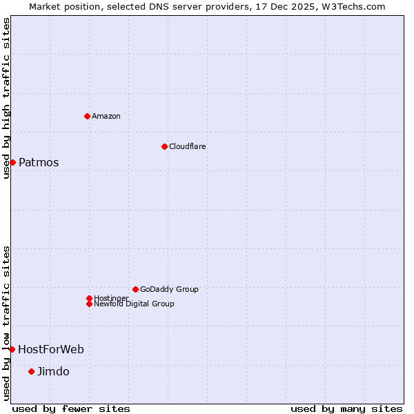 TechnologiesContent ManagementServer-side Languages Client-side Languages JavaScript Libraries CSS Frameworks Web Servers Web Panels Operating Systems Web Hosting Data Centers Reverse Proxies DNS Servers Email Servers SSL Certificate Authorities Content Delivery Traffic Analysis Tools Advertising Networks Tag Managers Social Widgets Site Elements Structured Data Markup Languages Character Encodings Image File Formats Top Level Domains Server Locations Content Languages | Technologies > DNS Servers > Technology usage comparison Comparison of the usage statistics of Jimdo vs. Patmos vs. HostForWeb for websitesThis report shows the usage statistics of Jimdo vs. Patmos vs. HostForWeb as DNS server provider on the web. See technologies overview for explanations on the methodologies used in the surveys. Our reports are updated daily. UsageThis diagram shows the percentages of websites using the selected technologies. How to read the diagram: