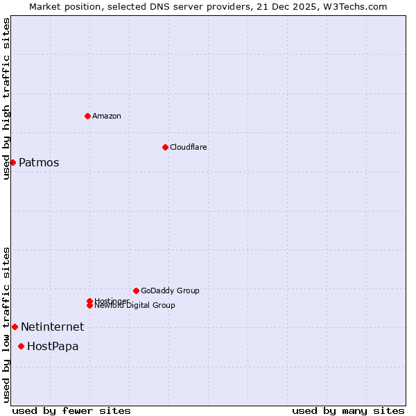 TechnologiesContent ManagementServer-side Languages Client-side Languages JavaScript Libraries CSS Frameworks Web Servers Web Panels Operating Systems Web Hosting Data Centers Reverse Proxies DNS Servers Email Servers SSL Certificate Authorities Content Delivery Traffic Analysis Tools Advertising Networks Tag Managers Social Widgets Site Elements Structured Data Markup Languages Character Encodings Image File Formats Top Level Domains Server Locations Content Languages | Technologies > DNS Servers > Technology usage comparison Comparison of the usage statistics of HostPapa vs. Netinternet vs. Patmos for websitesThis report shows the usage statistics of HostPapa vs. Netinternet vs. Patmos as DNS server provider on the web. See technologies overview for explanations on the methodologies used in the surveys. Our reports are updated daily. UsageThis diagram shows the percentages of websites using the selected technologies. How to read the diagram: