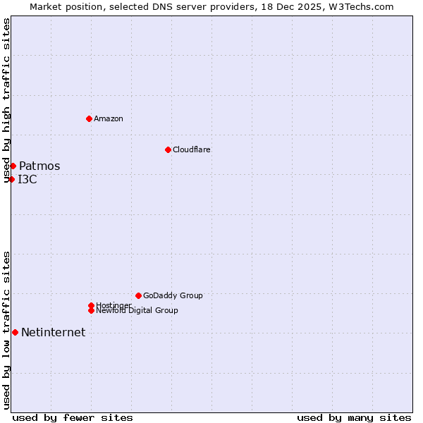 TechnologiesContent ManagementServer-side Languages Client-side Languages JavaScript Libraries CSS Frameworks Web Servers Web Panels Operating Systems Web Hosting Data Centers Reverse Proxies DNS Servers Email Servers SSL Certificate Authorities Content Delivery Traffic Analysis Tools Advertising Networks Tag Managers Social Widgets Site Elements Structured Data Markup Languages Character Encodings Image File Formats Top Level Domains Server Locations Content Languages | Technologies > DNS Servers > Technology usage comparison Comparison of the usage statistics of Netinternet vs. Patmos vs. I3C for websitesThis report shows the usage statistics of Netinternet vs. Patmos vs. I3C as DNS server provider on the web. See technologies overview for explanations on the methodologies used in the surveys. Our reports are updated daily. UsageThis diagram shows the percentages of websites using the selected technologies. How to read the diagram: