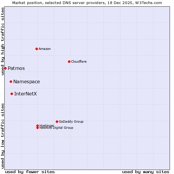 TechnologiesContent ManagementServer-side Languages Client-side Languages JavaScript Libraries CSS Frameworks Web Servers Web Panels Operating Systems Web Hosting Data Centers Reverse Proxies DNS Servers Email Servers SSL Certificate Authorities Content Delivery Traffic Analysis Tools Advertising Networks Tag Managers Social Widgets Site Elements Structured Data Markup Languages Character Encodings Image File Formats Top Level Domains Server Locations Content Languages | Technologies > DNS Servers > Technology usage comparison Comparison of the usage statistics of InterNetX vs. Namespace vs. Patmos for websitesThis report shows the usage statistics of InterNetX vs. Namespace vs. Patmos as DNS server provider on the web. See technologies overview for explanations on the methodologies used in the surveys. Our reports are updated daily. UsageThis diagram shows the percentages of websites using the selected technologies. How to read the diagram:
