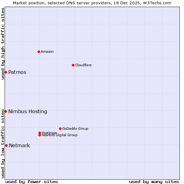 TechnologiesContent ManagementServer-side Languages Client-side Languages JavaScript Libraries CSS Frameworks Web Servers Web Panels Operating Systems Web Hosting Data Centers Reverse Proxies DNS Servers Email Servers SSL Certificate Authorities Content Delivery Traffic Analysis Tools Advertising Networks Tag Managers Social Widgets Site Elements Structured Data Markup Languages Character Encodings Image File Formats Top Level Domains Server Locations Content Languages | Technologies > DNS Servers > Technology usage comparison Comparison of the usage statistics of Netmark vs. Nimbus Hosting vs. Patmos for websitesThis report shows the usage statistics of Netmark vs. Nimbus Hosting vs. Patmos as DNS server provider on the web. See technologies overview for explanations on the methodologies used in the surveys. Our reports are updated daily. UsageThis diagram shows the percentages of websites using the selected technologies. How to read the diagram: