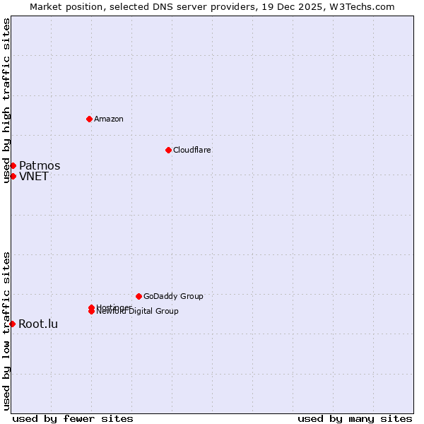 TechnologiesContent ManagementServer-side Languages Client-side Languages JavaScript Libraries CSS Frameworks Web Servers Web Panels Operating Systems Web Hosting Data Centers Reverse Proxies DNS Servers Email Servers SSL Certificate Authorities Content Delivery Traffic Analysis Tools Advertising Networks Tag Managers Social Widgets Site Elements Structured Data Markup Languages Character Encodings Image File Formats Top Level Domains Server Locations Content Languages | Technologies > DNS Servers > Technology usage comparison Comparison of the usage statistics of VNET vs. Patmos vs. Root.lu for websitesThis report shows the usage statistics of VNET vs. Patmos vs. Root.lu as DNS server provider on the web. See technologies overview for explanations on the methodologies used in the surveys. Our reports are updated daily. UsageThis diagram shows the percentages of websites using the selected technologies. How to read the diagram: