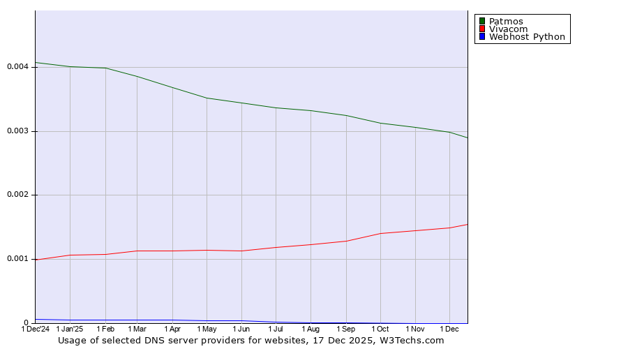 TechnologiesContent ManagementServer-side Languages Client-side Languages JavaScript Libraries CSS Frameworks Web Servers Web Panels Operating Systems Web Hosting Data Centers Reverse Proxies DNS Servers Email Servers SSL Certificate Authorities Content Delivery Traffic Analysis Tools Advertising Networks Tag Managers Social Widgets Site Elements Structured Data Markup Languages Character Encodings Image File Formats Top Level Domains Server Locations Content Languages | Technologies > DNS Servers > Technology usage comparison Comparison of the usage statistics of Patmos vs. Vivacom vs. Webhost Python for websitesThis report shows the usage statistics of Patmos vs. Vivacom vs. Webhost Python as DNS server provider on the web. See technologies overview for explanations on the methodologies used in the surveys. Our reports are updated daily. UsageThis diagram shows the percentages of websites using the selected technologies. How to read the diagram: