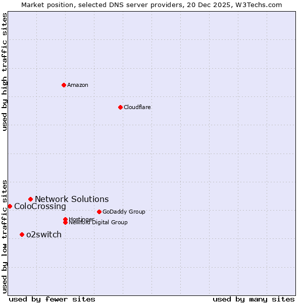 TechnologiesContent ManagementServer-side Languages Client-side Languages JavaScript Libraries CSS Frameworks Web Servers Web Panels Operating Systems Web Hosting Data Centers Reverse Proxies DNS Servers Email Servers SSL Certificate Authorities Content Delivery Traffic Analysis Tools Advertising Networks Tag Managers Social Widgets Site Elements Structured Data Markup Languages Character Encodings Image File Formats Top Level Domains Server Locations Content Languages | Technologies > DNS Servers > Technology usage comparison Comparison of the usage statistics of Network Solutions vs. o2switch vs. ColoCrossing for websitesThis report shows the usage statistics of Network Solutions vs. o2switch vs. ColoCrossing as DNS server provider on the web. See technologies overview for explanations on the methodologies used in the surveys. Our reports are updated daily. UsageThis diagram shows the percentages of websites using the selected technologies. How to read the diagram: