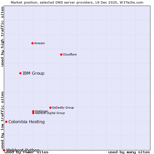 TechnologiesContent ManagementServer-side Languages Client-side Languages JavaScript Libraries CSS Frameworks Web Servers Web Panels Operating Systems Web Hosting Data Centers Reverse Proxies DNS Servers Email Servers SSL Certificate Authorities Content Delivery Traffic Analysis Tools Advertising Networks Tag Managers Social Widgets Site Elements Structured Data Markup Languages Character Encodings Image File Formats Top Level Domains Server Locations Content Languages | Technologies > DNS Servers > Technology usage comparison Comparison of the usage statistics of IBM Group vs. Colombia Hosting vs. Webhost Python for websitesThis report shows the usage statistics of IBM Group vs. Colombia Hosting vs. Webhost Python as DNS server provider on the web. See technologies overview for explanations on the methodologies used in the surveys. Our reports are updated daily. UsageThis diagram shows the percentages of websites using the selected technologies. How to read the diagram:
