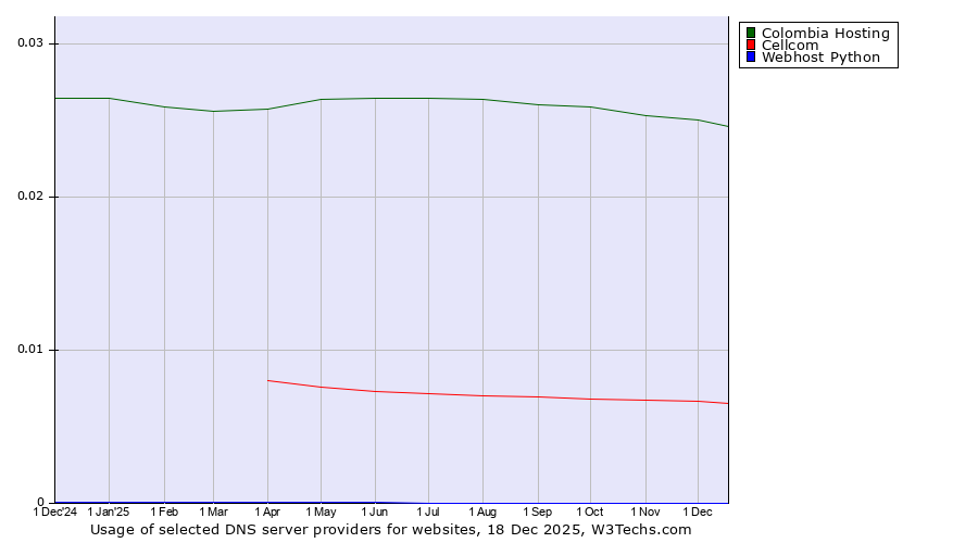 TechnologiesContent ManagementServer-side Languages Client-side Languages JavaScript Libraries CSS Frameworks Web Servers Web Panels Operating Systems Web Hosting Data Centers Reverse Proxies DNS Servers Email Servers SSL Certificate Authorities Content Delivery Traffic Analysis Tools Advertising Networks Tag Managers Social Widgets Site Elements Structured Data Markup Languages Character Encodings Image File Formats Top Level Domains Server Locations Content Languages | Technologies > DNS Servers > Technology usage comparison Comparison of the usage statistics of Colombia Hosting vs. Cellcom vs. Webhost Python for websitesThis report shows the usage statistics of Colombia Hosting vs. Cellcom vs. Webhost Python as DNS server provider on the web. See technologies overview for explanations on the methodologies used in the surveys. Our reports are updated daily. UsageThis diagram shows the percentages of websites using the selected technologies. How to read the diagram: