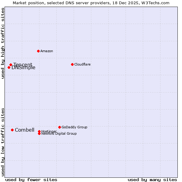 TechnologiesContent ManagementServer-side Languages Client-side Languages JavaScript Libraries CSS Frameworks Web Servers Web Panels Operating Systems Web Hosting Data Centers Reverse Proxies DNS Servers Email Servers SSL Certificate Authorities Content Delivery Traffic Analysis Tools Advertising Networks Tag Managers Social Widgets Site Elements Structured Data Markup Languages Character Encodings Image File Formats Top Level Domains Server Locations Content Languages | Technologies > DNS Servers > Technology usage comparison Comparison of the usage statistics of Combell vs. Tencent vs. DNSimple for websitesThis report shows the usage statistics of Combell vs. Tencent vs. DNSimple as DNS server provider on the web. See technologies overview for explanations on the methodologies used in the surveys. Our reports are updated daily. UsageThis diagram shows the percentages of websites using the selected technologies. How to read the diagram:
