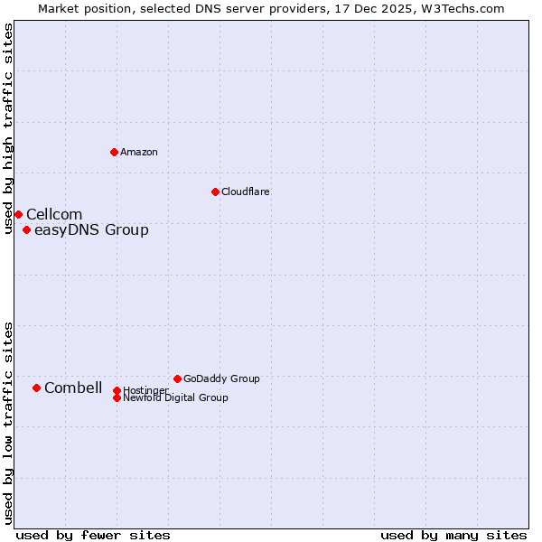 TechnologiesContent ManagementServer-side Languages Client-side Languages JavaScript Libraries CSS Frameworks Web Servers Web Panels Operating Systems Web Hosting Data Centers Reverse Proxies DNS Servers Email Servers SSL Certificate Authorities Content Delivery Traffic Analysis Tools Advertising Networks Tag Managers Social Widgets Site Elements Structured Data Markup Languages Character Encodings Image File Formats Top Level Domains Server Locations Content Languages | Technologies > DNS Servers > Technology usage comparison Comparison of the usage statistics of Combell vs. easyDNS Group vs. Cellcom for websitesThis report shows the usage statistics of Combell vs. easyDNS Group vs. Cellcom as DNS server provider on the web. See technologies overview for explanations on the methodologies used in the surveys. Our reports are updated daily. UsageThis diagram shows the percentages of websites using the selected technologies. How to read the diagram: