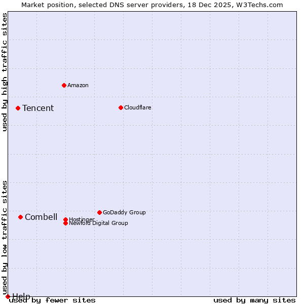 TechnologiesContent ManagementServer-side Languages Client-side Languages JavaScript Libraries CSS Frameworks Web Servers Web Panels Operating Systems Web Hosting Data Centers Reverse Proxies DNS Servers Email Servers SSL Certificate Authorities Content Delivery Traffic Analysis Tools Advertising Networks Tag Managers Social Widgets Site Elements Structured Data Markup Languages Character Encodings Image File Formats Top Level Domains Server Locations Content Languages | Technologies > DNS Servers > Technology usage comparison Comparison of the usage statistics of Combell vs. Tencent vs. Help for websitesThis report shows the usage statistics of Combell vs. Tencent vs. Help as DNS server provider on the web. See technologies overview for explanations on the methodologies used in the surveys. Our reports are updated daily. UsageThis diagram shows the percentages of websites using the selected technologies. How to read the diagram: