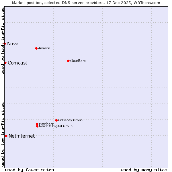 TechnologiesContent ManagementServer-side Languages Client-side Languages JavaScript Libraries CSS Frameworks Web Servers Web Panels Operating Systems Web Hosting Data Centers Reverse Proxies DNS Servers Email Servers SSL Certificate Authorities Content Delivery Traffic Analysis Tools Advertising Networks Tag Managers Social Widgets Site Elements Structured Data Markup Languages Character Encodings Image File Formats Top Level Domains Server Locations Content Languages | Technologies > DNS Servers > Technology usage comparison Comparison of the usage statistics of Netinternet vs. Comcast vs. Nova for websitesThis report shows the usage statistics of Netinternet vs. Comcast vs. Nova as DNS server provider on the web. See technologies overview for explanations on the methodologies used in the surveys. Our reports are updated daily. UsageThis diagram shows the percentages of websites using the selected technologies. How to read the diagram: