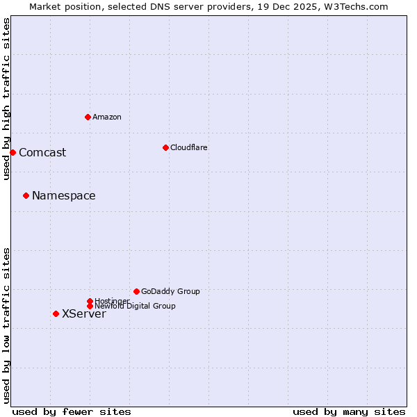 TechnologiesContent ManagementServer-side Languages Client-side Languages JavaScript Libraries CSS Frameworks Web Servers Web Panels Operating Systems Web Hosting Data Centers Reverse Proxies DNS Servers Email Servers SSL Certificate Authorities Content Delivery Traffic Analysis Tools Advertising Networks Tag Managers Social Widgets Site Elements Structured Data Markup Languages Character Encodings Image File Formats Top Level Domains Server Locations Content Languages | Technologies > DNS Servers > Technology usage comparison Comparison of the usage statistics of XServer vs. Namespace vs. Comcast for websitesThis report shows the usage statistics of XServer vs. Namespace vs. Comcast as DNS server provider on the web. See technologies overview for explanations on the methodologies used in the surveys. Our reports are updated daily. UsageThis diagram shows the percentages of websites using the selected technologies. How to read the diagram: