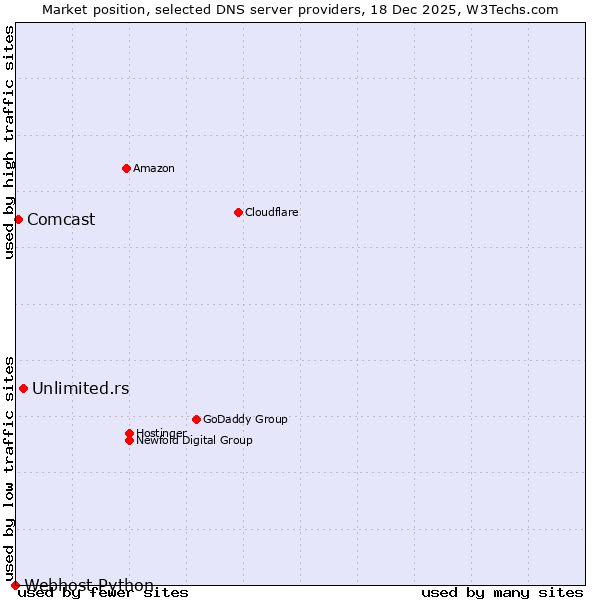 TechnologiesContent ManagementServer-side Languages Client-side Languages JavaScript Libraries CSS Frameworks Web Servers Web Panels Operating Systems Web Hosting Data Centers Reverse Proxies DNS Servers Email Servers SSL Certificate Authorities Content Delivery Traffic Analysis Tools Advertising Networks Tag Managers Social Widgets Site Elements Structured Data Markup Languages Character Encodings Image File Formats Top Level Domains Server Locations Content Languages | Technologies > DNS Servers > Technology usage comparison Comparison of the usage statistics of Unlimited.rs vs. Comcast vs. Webhost Python for websitesThis report shows the usage statistics of Unlimited.rs vs. Comcast vs. Webhost Python as DNS server provider on the web. See technologies overview for explanations on the methodologies used in the surveys. Our reports are updated daily. UsageThis diagram shows the percentages of websites using the selected technologies. How to read the diagram: