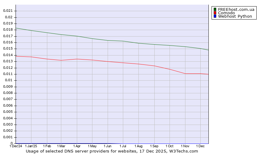 TechnologiesContent ManagementServer-side Languages Client-side Languages JavaScript Libraries CSS Frameworks Web Servers Web Panels Operating Systems Web Hosting Data Centers Reverse Proxies DNS Servers Email Servers SSL Certificate Authorities Content Delivery Traffic Analysis Tools Advertising Networks Tag Managers Social Widgets Site Elements Structured Data Markup Languages Character Encodings Image File Formats Top Level Domains Server Locations Content Languages | Technologies > DNS Servers > Technology usage comparison Comparison of the usage statistics of FREEhost.com.ua vs. Comodo vs. Webhost Python for websitesThis report shows the usage statistics of FREEhost.com.ua vs. Comodo vs. Webhost Python as DNS server provider on the web. See technologies overview for explanations on the methodologies used in the surveys. Our reports are updated daily. UsageThis diagram shows the percentages of websites using the selected technologies. How to read the diagram: