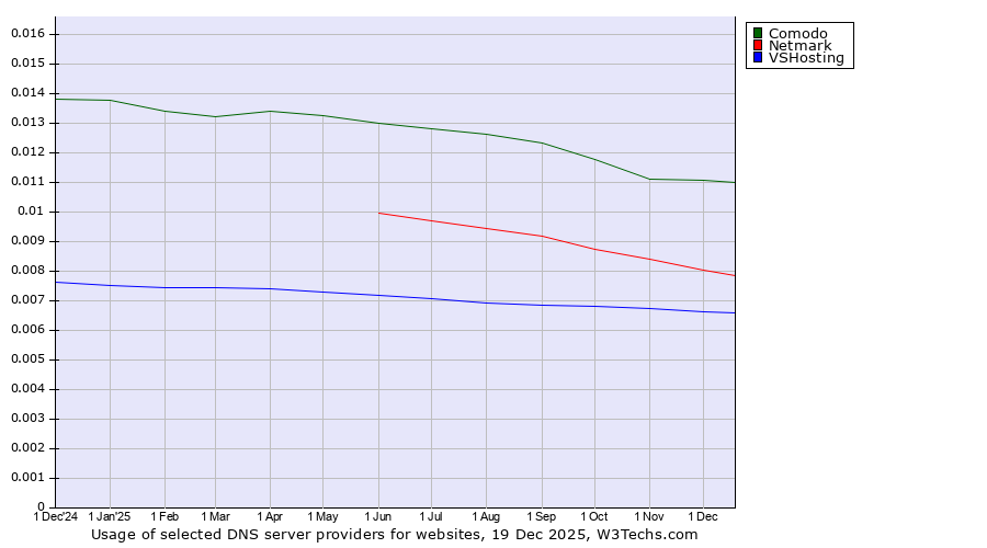 TechnologiesContent ManagementServer-side Languages Client-side Languages JavaScript Libraries CSS Frameworks Web Servers Web Panels Operating Systems Web Hosting Data Centers Reverse Proxies DNS Servers Email Servers SSL Certificate Authorities Content Delivery Traffic Analysis Tools Advertising Networks Tag Managers Social Widgets Site Elements Structured Data Markup Languages Character Encodings Image File Formats Top Level Domains Server Locations Content Languages | Technologies > DNS Servers > Technology usage comparison Comparison of the usage statistics of Comodo vs. Netmark vs. VSHosting for websitesThis report shows the usage statistics of Comodo vs. Netmark vs. VSHosting as DNS server provider on the web. See technologies overview for explanations on the methodologies used in the surveys. Our reports are updated daily. UsageThis diagram shows the percentages of websites using the selected technologies. How to read the diagram: