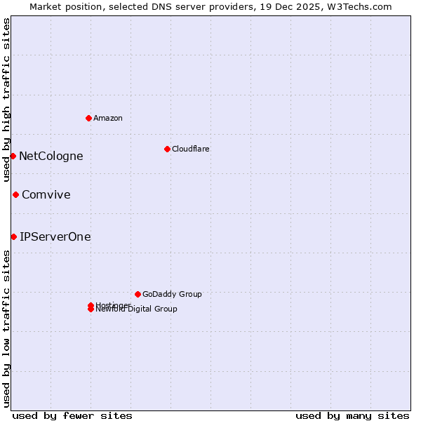 TechnologiesContent ManagementServer-side Languages Client-side Languages JavaScript Libraries CSS Frameworks Web Servers Web Panels Operating Systems Web Hosting Data Centers Reverse Proxies DNS Servers Email Servers SSL Certificate Authorities Content Delivery Traffic Analysis Tools Advertising Networks Tag Managers Social Widgets Site Elements Structured Data Markup Languages Character Encodings Image File Formats Top Level Domains Server Locations Content Languages | Technologies > DNS Servers > Technology usage comparison Comparison of the usage statistics of Comvive vs. IPServerOne vs. NetCologne for websitesThis report shows the usage statistics of Comvive vs. IPServerOne vs. NetCologne as DNS server provider on the web. See technologies overview for explanations on the methodologies used in the surveys. Our reports are updated daily. UsageThis diagram shows the percentages of websites using the selected technologies. How to read the diagram: