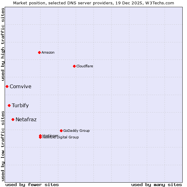 TechnologiesContent ManagementServer-side Languages Client-side Languages JavaScript Libraries CSS Frameworks Web Servers Web Panels Operating Systems Web Hosting Data Centers Reverse Proxies DNS Servers Email Servers SSL Certificate Authorities Content Delivery Traffic Analysis Tools Advertising Networks Tag Managers Social Widgets Site Elements Structured Data Markup Languages Character Encodings Image File Formats Top Level Domains Server Locations Content Languages | Technologies > DNS Servers > Technology usage comparison Comparison of the usage statistics of Netafraz vs. Turbify vs. Comvive for websitesThis report shows the usage statistics of Netafraz vs. Turbify vs. Comvive as DNS server provider on the web. See technologies overview for explanations on the methodologies used in the surveys. Our reports are updated daily. UsageThis diagram shows the percentages of websites using the selected technologies. How to read the diagram: