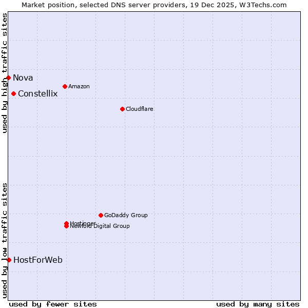 TechnologiesContent ManagementServer-side Languages Client-side Languages JavaScript Libraries CSS Frameworks Web Servers Web Panels Operating Systems Web Hosting Data Centers Reverse Proxies DNS Servers Email Servers SSL Certificate Authorities Content Delivery Traffic Analysis Tools Advertising Networks Tag Managers Social Widgets Site Elements Structured Data Markup Languages Character Encodings Image File Formats Top Level Domains Server Locations Content Languages | Technologies > DNS Servers > Technology usage comparison Comparison of the usage statistics of Constellix vs. HostForWeb vs. Nova for websitesThis report shows the usage statistics of Constellix vs. HostForWeb vs. Nova as DNS server provider on the web. See technologies overview for explanations on the methodologies used in the surveys. Our reports are updated daily. UsageThis diagram shows the percentages of websites using the selected technologies. How to read the diagram: