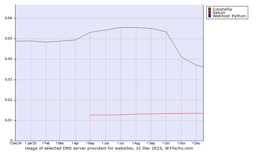 TechnologiesContent ManagementServer-side Languages Client-side Languages JavaScript Libraries CSS Frameworks Web Servers Web Panels Operating Systems Web Hosting Data Centers Reverse Proxies DNS Servers Email Servers SSL Certificate Authorities Content Delivery Traffic Analysis Tools Advertising Networks Tag Managers Social Widgets Site Elements Structured Data Markup Languages Character Encodings Image File Formats Top Level Domains Server Locations Content Languages | Technologies > DNS Servers > Technology usage comparison Comparison of the usage statistics of Constellix vs. Setcor vs. Webhost Python for websitesThis report shows the usage statistics of Constellix vs. Setcor vs. Webhost Python as DNS server provider on the web. See technologies overview for explanations on the methodologies used in the surveys. Our reports are updated daily. UsageThis diagram shows the percentages of websites using the selected technologies. How to read the diagram: