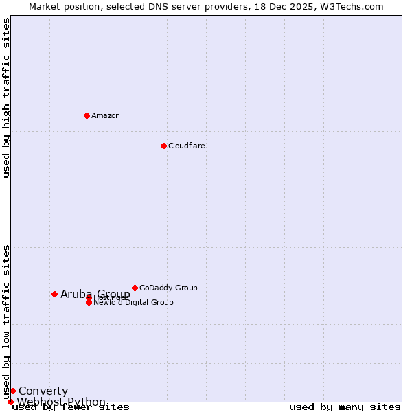 TechnologiesContent ManagementServer-side Languages Client-side Languages JavaScript Libraries CSS Frameworks Web Servers Web Panels Operating Systems Web Hosting Data Centers Reverse Proxies DNS Servers Email Servers SSL Certificate Authorities Content Delivery Traffic Analysis Tools Advertising Networks Tag Managers Social Widgets Site Elements Structured Data Markup Languages Character Encodings Image File Formats Top Level Domains Server Locations Content Languages | Technologies > DNS Servers > Technology usage comparison Comparison of the usage statistics of Aruba Group vs. Converty vs. Webhost Python for websitesThis report shows the usage statistics of Aruba Group vs. Converty vs. Webhost Python as DNS server provider on the web. See technologies overview for explanations on the methodologies used in the surveys. Our reports are updated daily. UsageThis diagram shows the percentages of websites using the selected technologies. How to read the diagram:
