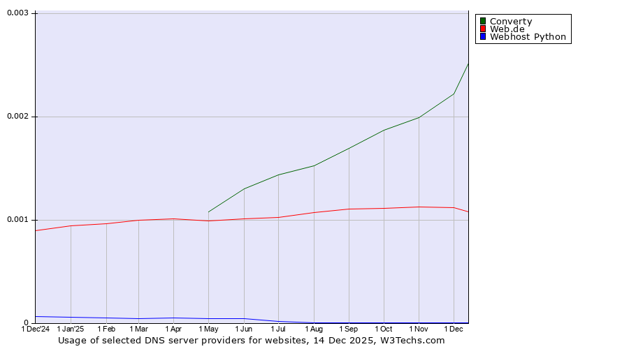 TechnologiesContent ManagementServer-side Languages Client-side Languages JavaScript Libraries CSS Frameworks Web Servers Web Panels Operating Systems Web Hosting Data Centers Reverse Proxies DNS Servers Email Servers SSL Certificate Authorities Content Delivery Traffic Analysis Tools Advertising Networks Tag Managers Social Widgets Site Elements Structured Data Markup Languages Character Encodings Image File Formats Top Level Domains Server Locations Content Languages | Technologies > DNS Servers > Technology usage comparison Comparison of the usage statistics of Converty vs. Web.de vs. Webhost Python for websitesThis report shows the usage statistics of Converty vs. Web.de vs. Webhost Python as DNS server provider on the web. See technologies overview for explanations on the methodologies used in the surveys. Our reports are updated daily. UsageThis diagram shows the percentages of websites using the selected technologies. How to read the diagram: