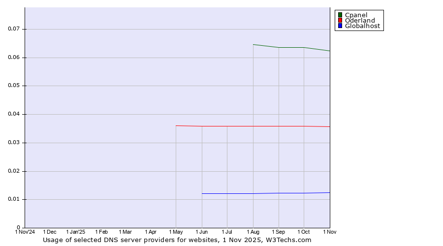 TechnologiesContent ManagementServer-side Languages Client-side Languages JavaScript Libraries CSS Frameworks Web Servers Web Panels Operating Systems Web Hosting Data Centers Reverse Proxies DNS Servers Email Servers SSL Certificate Authorities Content Delivery Traffic Analysis Tools Advertising Networks Tag Managers Social Widgets Site Elements Structured Data Markup Languages Character Encodings Image File Formats Top Level Domains Server Locations Content Languages | Technologies > DNS Servers > Technology usage comparison Comparison of the usage statistics of Cpanel vs. Oderland vs. Globalhost for websitesThis report shows the usage statistics of Cpanel vs. Oderland vs. Globalhost as DNS server provider on the web. See technologies overview for explanations on the methodologies used in the surveys. Our reports are updated daily. UsageThis diagram shows the percentages of websites using the selected technologies. How to read the diagram: