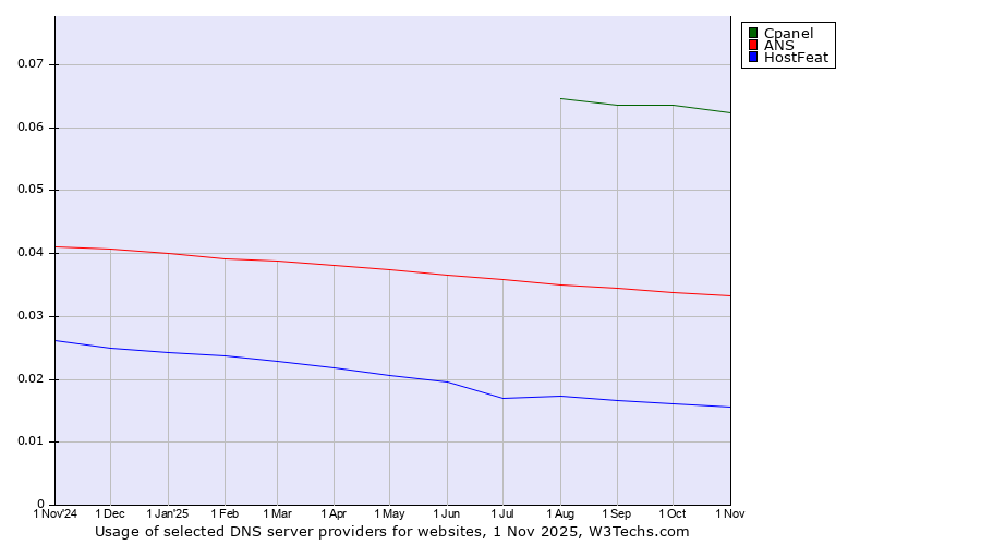 TechnologiesContent ManagementServer-side Languages Client-side Languages JavaScript Libraries CSS Frameworks Web Servers Web Panels Operating Systems Web Hosting Data Centers Reverse Proxies DNS Servers Email Servers SSL Certificate Authorities Content Delivery Traffic Analysis Tools Advertising Networks Tag Managers Social Widgets Site Elements Structured Data Markup Languages Character Encodings Image File Formats Top Level Domains Server Locations Content Languages | Technologies > DNS Servers > Technology usage comparison Comparison of the usage statistics of Cpanel vs. ANS vs. HostFeat for websitesThis report shows the usage statistics of Cpanel vs. ANS vs. HostFeat as DNS server provider on the web. See technologies overview for explanations on the methodologies used in the surveys. Our reports are updated daily. UsageThis diagram shows the percentages of websites using the selected technologies. How to read the diagram: