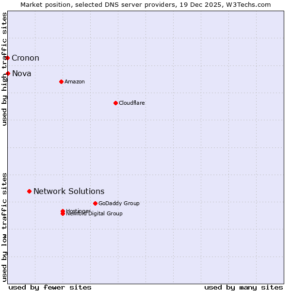 TechnologiesContent ManagementServer-side Languages Client-side Languages JavaScript Libraries CSS Frameworks Web Servers Web Panels Operating Systems Web Hosting Data Centers Reverse Proxies DNS Servers Email Servers SSL Certificate Authorities Content Delivery Traffic Analysis Tools Advertising Networks Tag Managers Social Widgets Site Elements Structured Data Markup Languages Character Encodings Image File Formats Top Level Domains Server Locations Content Languages | Technologies > DNS Servers > Technology usage comparison Comparison of the usage statistics of Network Solutions vs. Nova vs. Cronon for websitesThis report shows the usage statistics of Network Solutions vs. Nova vs. Cronon as DNS server provider on the web. See technologies overview for explanations on the methodologies used in the surveys. Our reports are updated daily. UsageThis diagram shows the percentages of websites using the selected technologies. How to read the diagram: