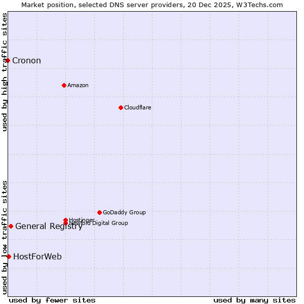 TechnologiesContent ManagementServer-side Languages Client-side Languages JavaScript Libraries CSS Frameworks Web Servers Web Panels Operating Systems Web Hosting Data Centers Reverse Proxies DNS Servers Email Servers SSL Certificate Authorities Content Delivery Traffic Analysis Tools Advertising Networks Tag Managers Social Widgets Site Elements Structured Data Markup Languages Character Encodings Image File Formats Top Level Domains Server Locations Content Languages | Technologies > DNS Servers > Technology usage comparison Comparison of the usage statistics of General Registry vs. HostForWeb vs. Cronon for websitesThis report shows the usage statistics of General Registry vs. HostForWeb vs. Cronon as DNS server provider on the web. See technologies overview for explanations on the methodologies used in the surveys. Our reports are updated daily. UsageThis diagram shows the percentages of websites using the selected technologies. How to read the diagram: