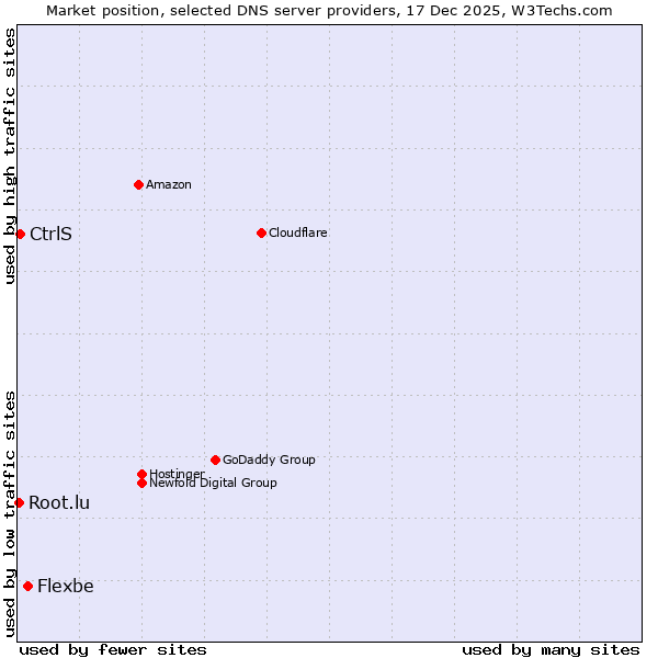 TechnologiesContent ManagementServer-side Languages Client-side Languages JavaScript Libraries CSS Frameworks Web Servers Web Panels Operating Systems Web Hosting Data Centers Reverse Proxies DNS Servers Email Servers SSL Certificate Authorities Content Delivery Traffic Analysis Tools Advertising Networks Tag Managers Social Widgets Site Elements Structured Data Markup Languages Character Encodings Image File Formats Top Level Domains Server Locations Content Languages | Technologies > DNS Servers > Technology usage comparison Comparison of the usage statistics of Flexbe vs. CtrlS vs. Root.lu for websitesThis report shows the usage statistics of Flexbe vs. CtrlS vs. Root.lu as DNS server provider on the web. See technologies overview for explanations on the methodologies used in the surveys. Our reports are updated daily. UsageThis diagram shows the percentages of websites using the selected technologies. How to read the diagram: