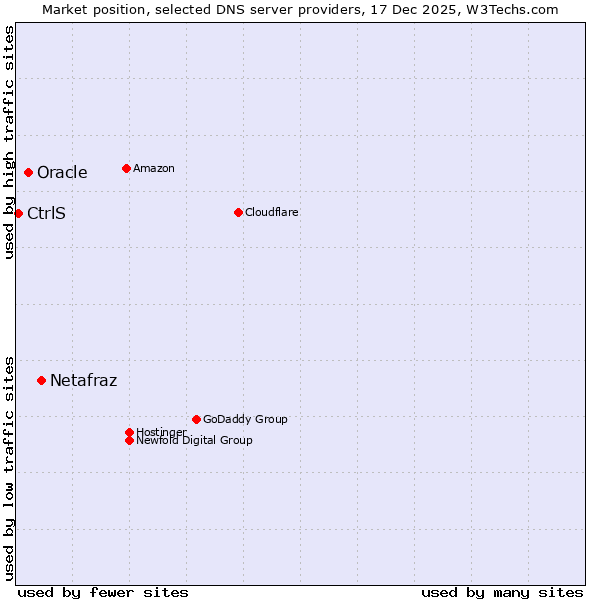 TechnologiesContent ManagementServer-side Languages Client-side Languages JavaScript Libraries CSS Frameworks Web Servers Web Panels Operating Systems Web Hosting Data Centers Reverse Proxies DNS Servers Email Servers SSL Certificate Authorities Content Delivery Traffic Analysis Tools Advertising Networks Tag Managers Social Widgets Site Elements Structured Data Markup Languages Character Encodings Image File Formats Top Level Domains Server Locations Content Languages | Technologies > DNS Servers > Technology usage comparison Comparison of the usage statistics of Netafraz vs. Oracle vs. CtrlS for websitesThis report shows the usage statistics of Netafraz vs. Oracle vs. CtrlS as DNS server provider on the web. See technologies overview for explanations on the methodologies used in the surveys. Our reports are updated daily. UsageThis diagram shows the percentages of websites using the selected technologies. How to read the diagram: