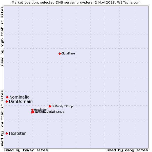 TechnologiesContent ManagementServer-side Languages Client-side Languages JavaScript Libraries CSS Frameworks Web Servers Web Panels Operating Systems Web Hosting Data Centers Reverse Proxies DNS Servers Email Servers SSL Certificate Authorities Content Delivery Traffic Analysis Tools Advertising Networks Tag Managers Social Widgets Site Elements Structured Data Markup Languages Character Encodings Image File Formats Top Level Domains Server Locations Content Languages | Technologies > DNS Servers > Technology usage comparison Comparison of the usage statistics of Nominalia vs. DanDomain vs. Hoststar for websitesThis report shows the usage statistics of Nominalia vs. DanDomain vs. Hoststar as DNS server provider on the web. See technologies overview for explanations on the methodologies used in the surveys. Our reports are updated daily. UsageThis diagram shows the percentages of websites using the selected technologies. How to read the diagram: