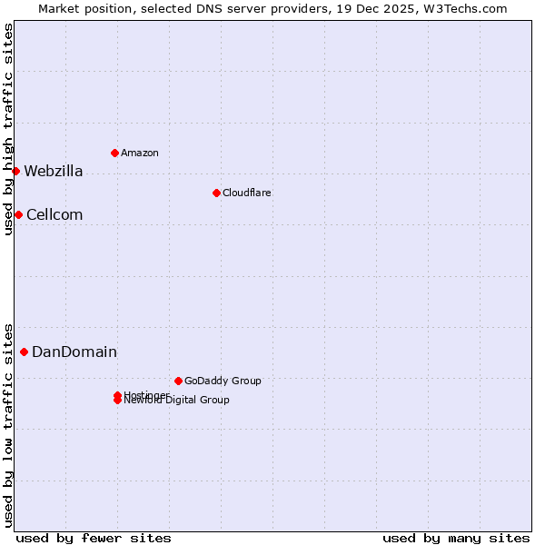 TechnologiesContent ManagementServer-side Languages Client-side Languages JavaScript Libraries CSS Frameworks Web Servers Web Panels Operating Systems Web Hosting Data Centers Reverse Proxies DNS Servers Email Servers SSL Certificate Authorities Content Delivery Traffic Analysis Tools Advertising Networks Tag Managers Social Widgets Site Elements Structured Data Markup Languages Character Encodings Image File Formats Top Level Domains Server Locations Content Languages | Technologies > DNS Servers > Technology usage comparison Comparison of the usage statistics of DanDomain vs. Cellcom vs. Webzilla for websitesThis report shows the usage statistics of DanDomain vs. Cellcom vs. Webzilla as DNS server provider on the web. See technologies overview for explanations on the methodologies used in the surveys. Our reports are updated daily. UsageThis diagram shows the percentages of websites using the selected technologies. How to read the diagram: