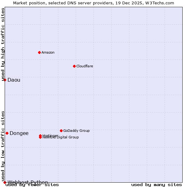 TechnologiesContent ManagementServer-side Languages Client-side Languages JavaScript Libraries CSS Frameworks Web Servers Web Panels Operating Systems Web Hosting Data Centers Reverse Proxies DNS Servers Email Servers SSL Certificate Authorities Content Delivery Traffic Analysis Tools Advertising Networks Tag Managers Social Widgets Site Elements Structured Data Markup Languages Character Encodings Image File Formats Top Level Domains Server Locations Content Languages | Technologies > DNS Servers > Technology usage comparison Comparison of the usage statistics of Dongee vs. Daou vs. Webhost Python for websitesThis report shows the usage statistics of Dongee vs. Daou vs. Webhost Python as DNS server provider on the web. See technologies overview for explanations on the methodologies used in the surveys. Our reports are updated daily. UsageThis diagram shows the percentages of websites using the selected technologies. How to read the diagram: