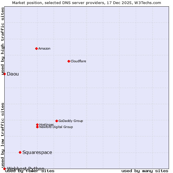 TechnologiesContent ManagementServer-side Languages Client-side Languages JavaScript Libraries CSS Frameworks Web Servers Web Panels Operating Systems Web Hosting Data Centers Reverse Proxies DNS Servers Email Servers SSL Certificate Authorities Content Delivery Traffic Analysis Tools Advertising Networks Tag Managers Social Widgets Site Elements Structured Data Markup Languages Character Encodings Image File Formats Top Level Domains Server Locations Content Languages | Technologies > DNS Servers > Technology usage comparison Comparison of the usage statistics of Squarespace vs. Daou vs. Webhost Python for websitesThis report shows the usage statistics of Squarespace vs. Daou vs. Webhost Python as DNS server provider on the web. See technologies overview for explanations on the methodologies used in the surveys. Our reports are updated daily. UsageThis diagram shows the percentages of websites using the selected technologies. How to read the diagram: