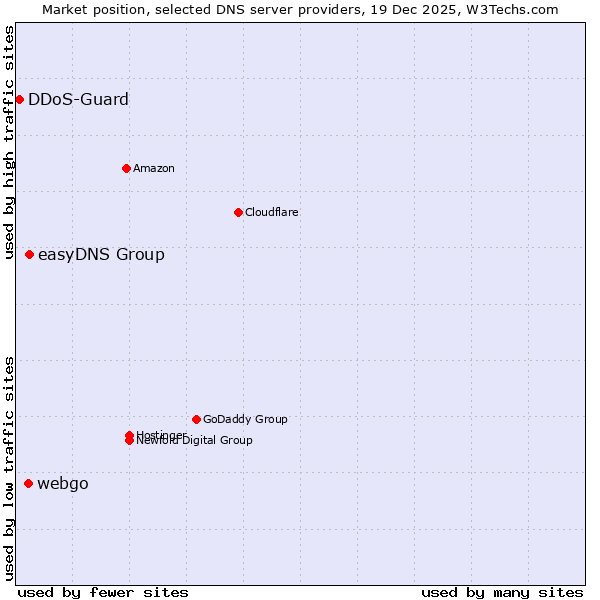 TechnologiesContent ManagementServer-side Languages Client-side Languages JavaScript Libraries CSS Frameworks Web Servers Web Panels Operating Systems Web Hosting Data Centers Reverse Proxies DNS Servers Email Servers SSL Certificate Authorities Content Delivery Traffic Analysis Tools Advertising Networks Tag Managers Social Widgets Site Elements Structured Data Markup Languages Character Encodings Image File Formats Top Level Domains Server Locations Content Languages | Technologies > DNS Servers > Technology usage comparison Comparison of the usage statistics of easyDNS Group vs. webgo vs. DDoS-Guard for websitesThis report shows the usage statistics of easyDNS Group vs. webgo vs. DDoS-Guard as DNS server provider on the web. See technologies overview for explanations on the methodologies used in the surveys. Our reports are updated daily. UsageThis diagram shows the percentages of websites using the selected technologies. How to read the diagram: